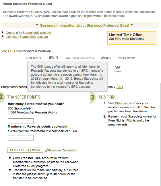 However, until March 31, 2012 Amex is running a 2:1 ratio, which is better but still not amazing. The bonus is hard-coded into the transfer ratio, so no need to register and the points should transfer automatically. Just log-in to Membershiprewards.com -> Use points -> Hotels and then Starwood along the side of the screen or click here.