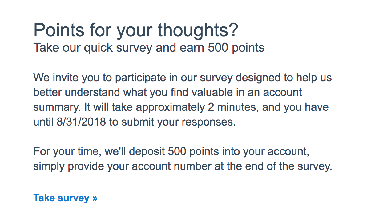 Business Extra routinely offers promotions like this where you can earn up to 500 miles, for registering a new account, qualifying flight activity or, in this case, taking a survey. Note that to get to the survey, you have to follow a link supplied within your account summary. I never read my monthly account statements and I'm very grateful that a friend pointed out this offer, as I'm sure many of us delete these emails without reading them.