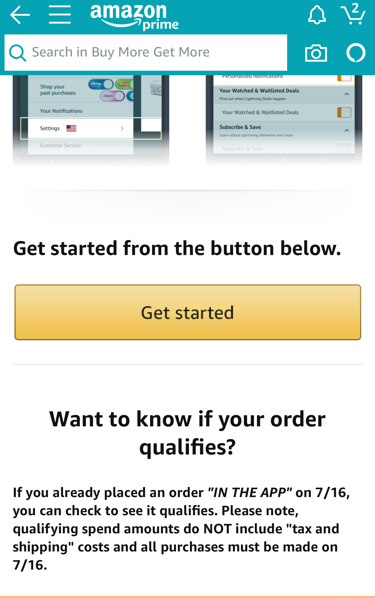 While you must make your purchases through the app to get the discount, you can check to see if you're targeted by either visiting the campaign page on Amazon's website, looking for the "Shop Prime day and get up to $60" banner on the homepage of the app or searching "Get More" on the app.