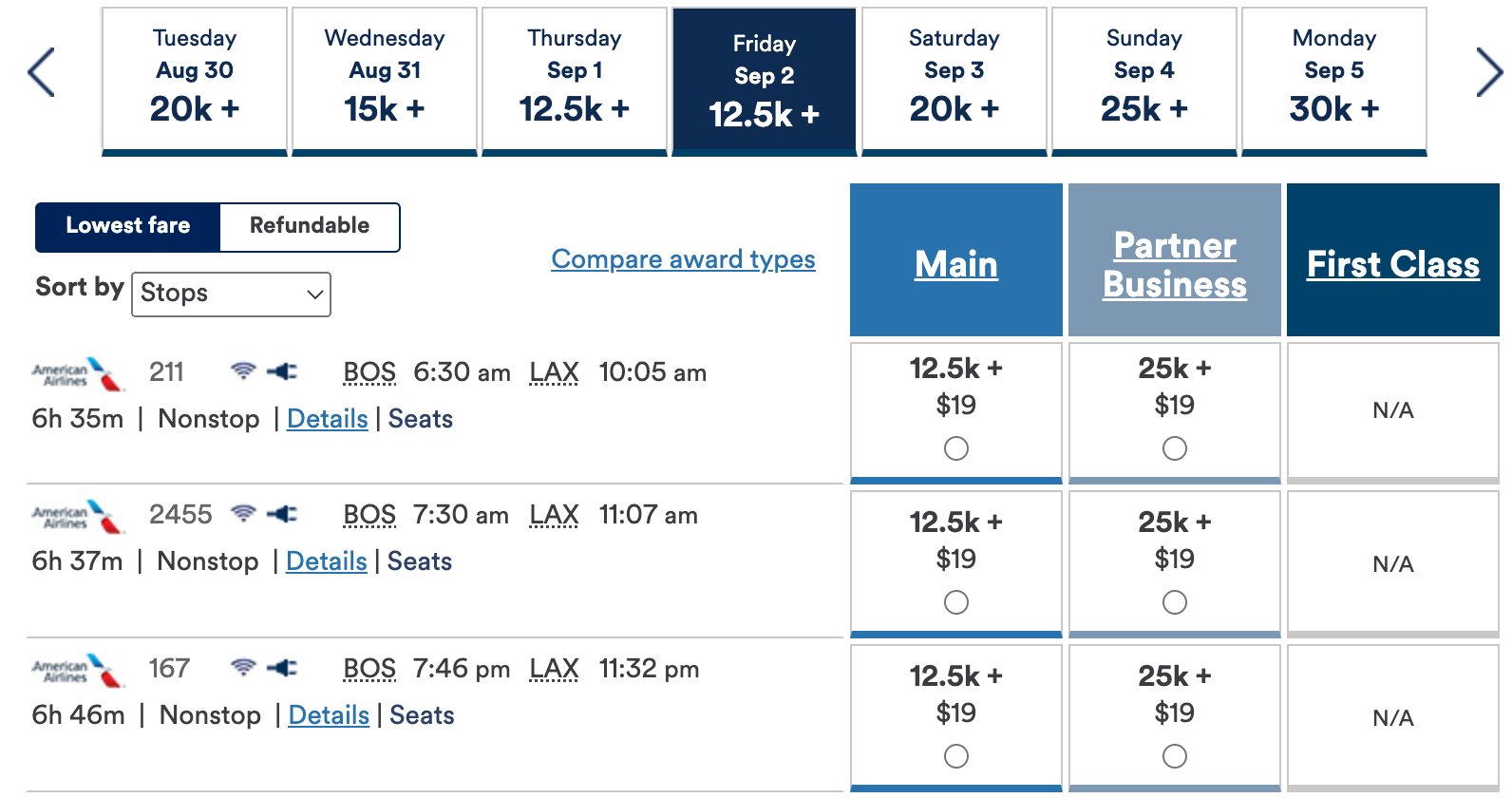 Well, good news: TPG has spotted widespread business class award space on premium transcontinental American Airlines flights this fall. Specifically, we're seeing lots of availability on flights from Los Angeles International Airport (LAX) to Boston Logan International Airport (BOS) and Miami International Airport (MIA) from August through November 2022. Many dates even have four or more seats available.