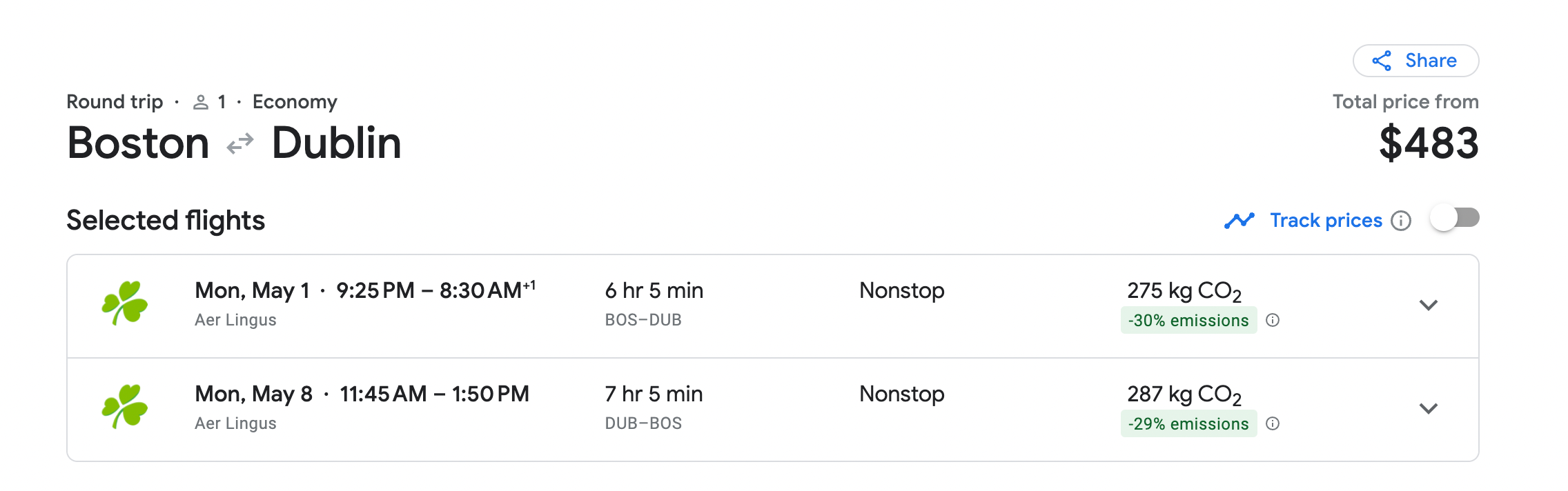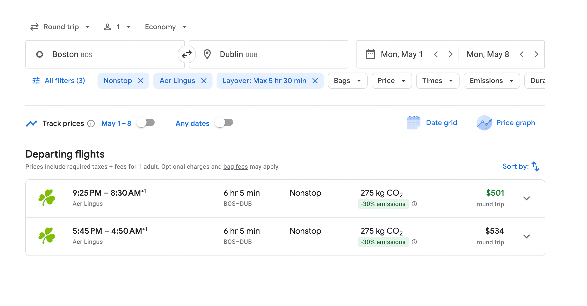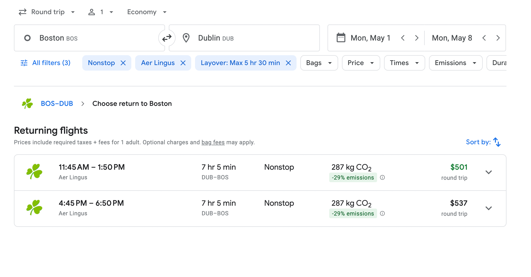 For a round-trip flight from Boston to Dublin in May, Google Flights only offers two Aer Lingus flights. One costs $501, and the other is slightly more expensive at $534.