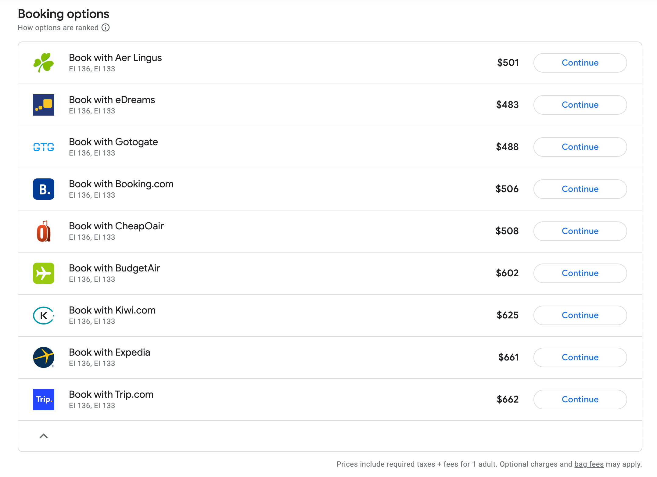 Sometimes, Google Flights advertises a different fare compared to what you would find on an airline's website due to the availability of third-party booking options. In this case, Google Flights features a variety of third-party booking sites for this flight, but you'd be better off booking your flights on Aer Lingus' website.