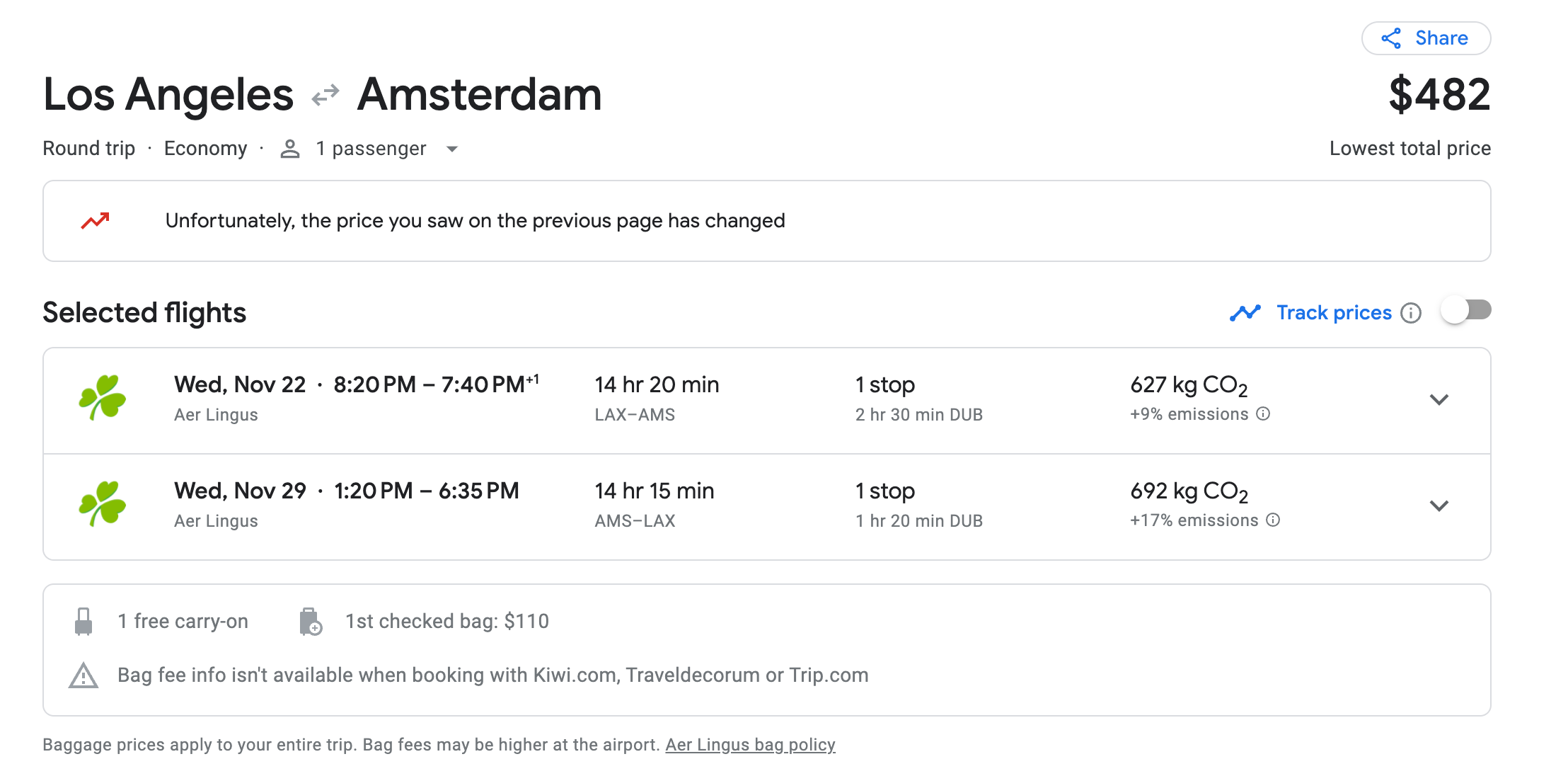 The returning flight is a bit more expensive, coming in at about $271 for a Saver seat, and brings the total to $481.28. Also, note that there is a layover at Dublin Airport (DUB) each way.