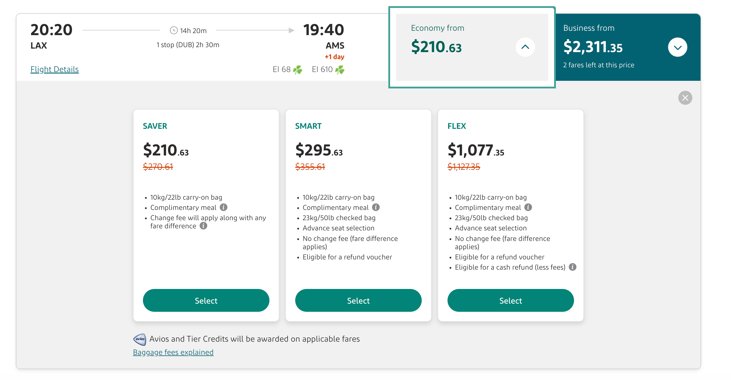 Google Flights will bring you to Aer Lingus' website to finish booking these flights. The website will prompt you to choose which ticket tier you want to buy. The discounted tickets we're looking at are part of the Saver fare, which comes with one carry-on bag and a complimentary meal.
