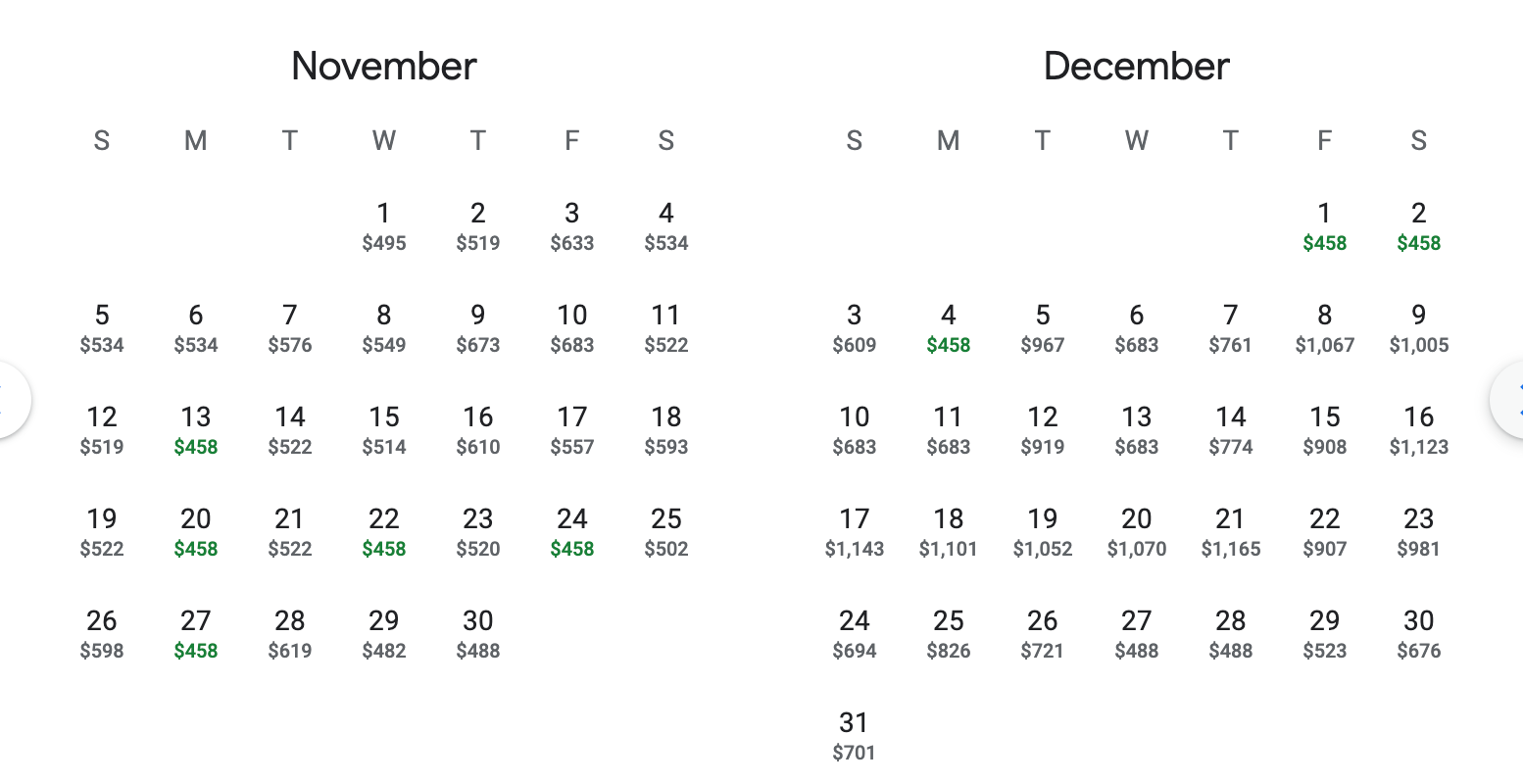 Let's say you want to spend Thanksgiving in Amsterdam. A quick search on Google Flights shows some good availability around those dates.