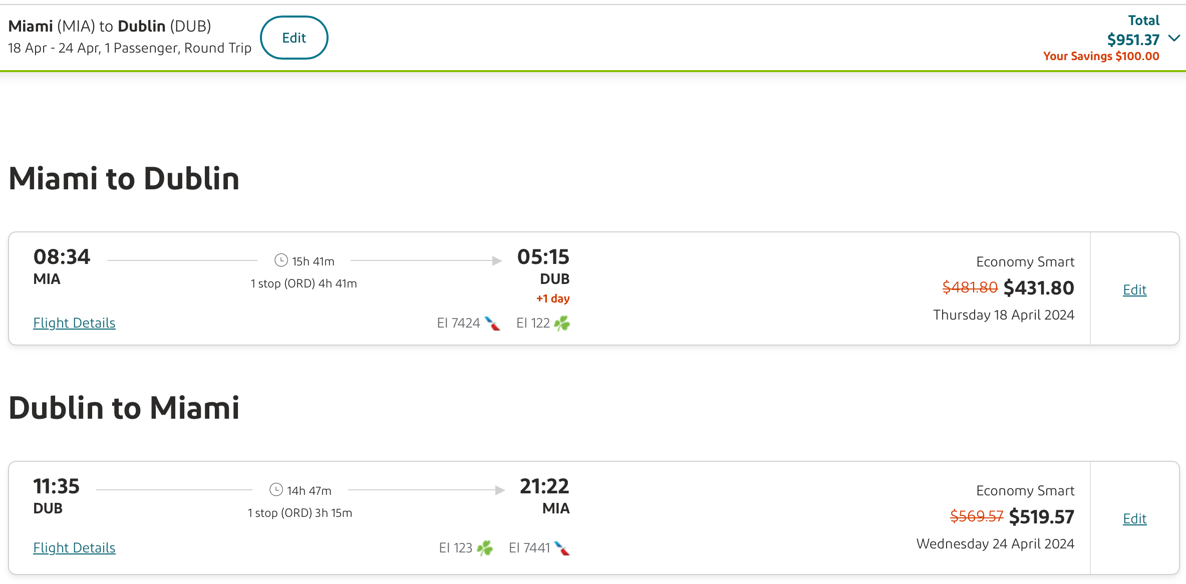 I live in Miami, so I'll start with a nice deal I found on a flight to the Irish capital. This round-trip itinerary from Miami International Airport (MIA) to Dublin Airport (DUB) in late April costs less than $1,000 with the applied $100 discount. There is a layover in Chicago, but if saving a significant amount of money is worth the longer travel time, this is a good option.