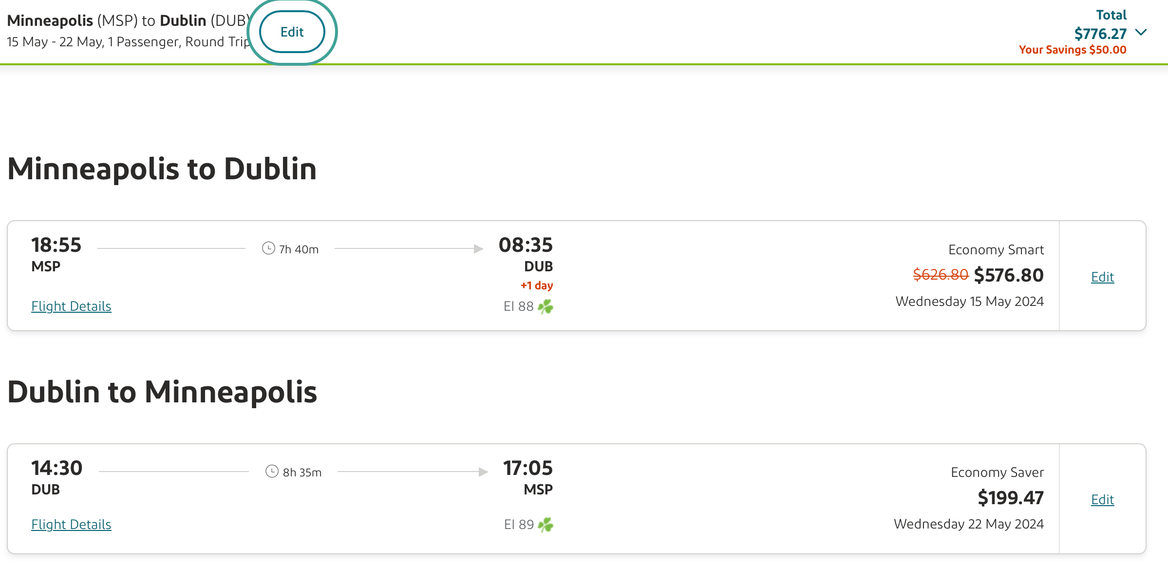 Aer Lingus resumes service out of Minneapolis on April 29, and you can find some great availability for travel to Ireland from the Twin Cities. We found lots of availability in this sale, including this nonstop trip from Minneapolis-St. Paul International Airport (MSP) to Dublin in mid-May for $776.27 round-trip with the applied discount.