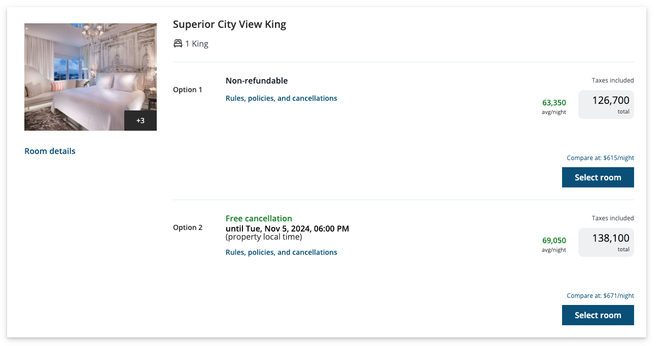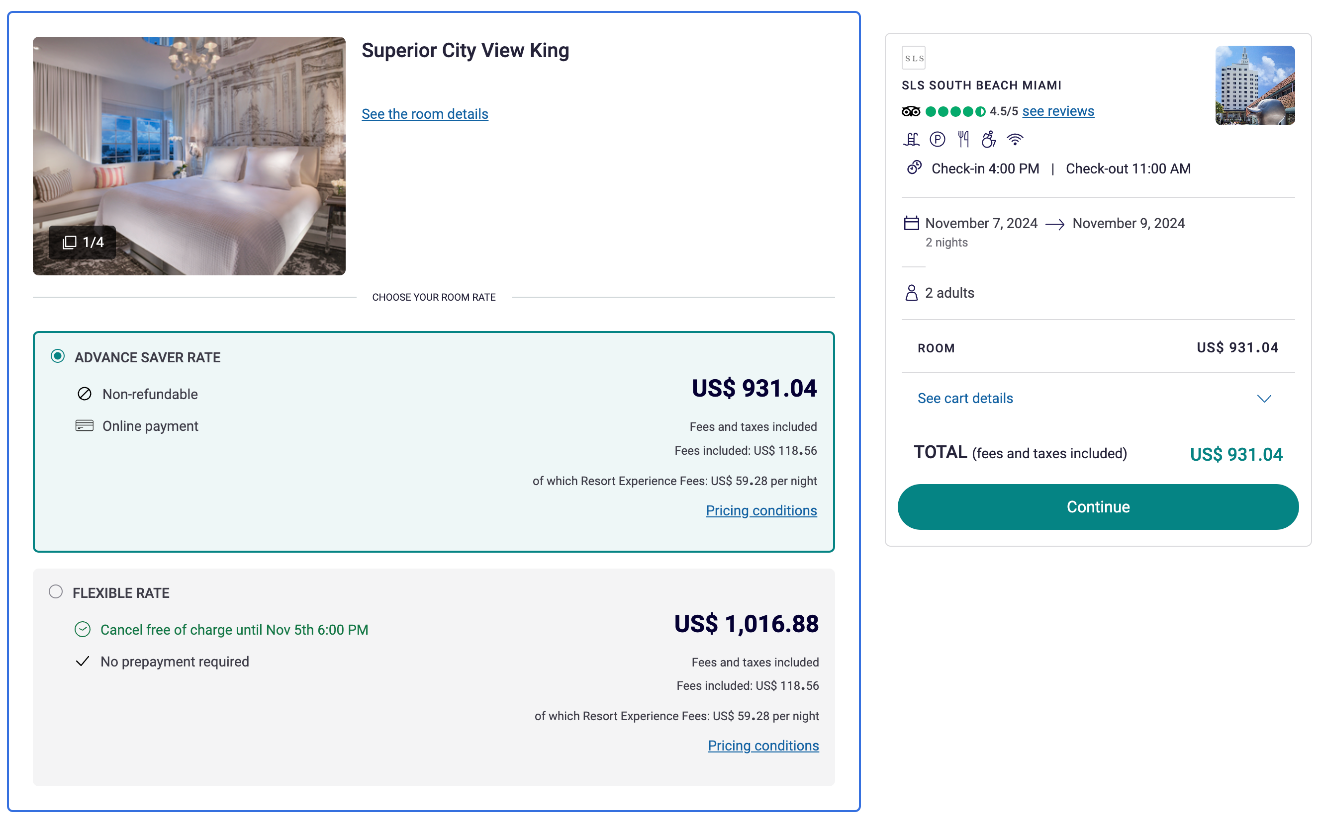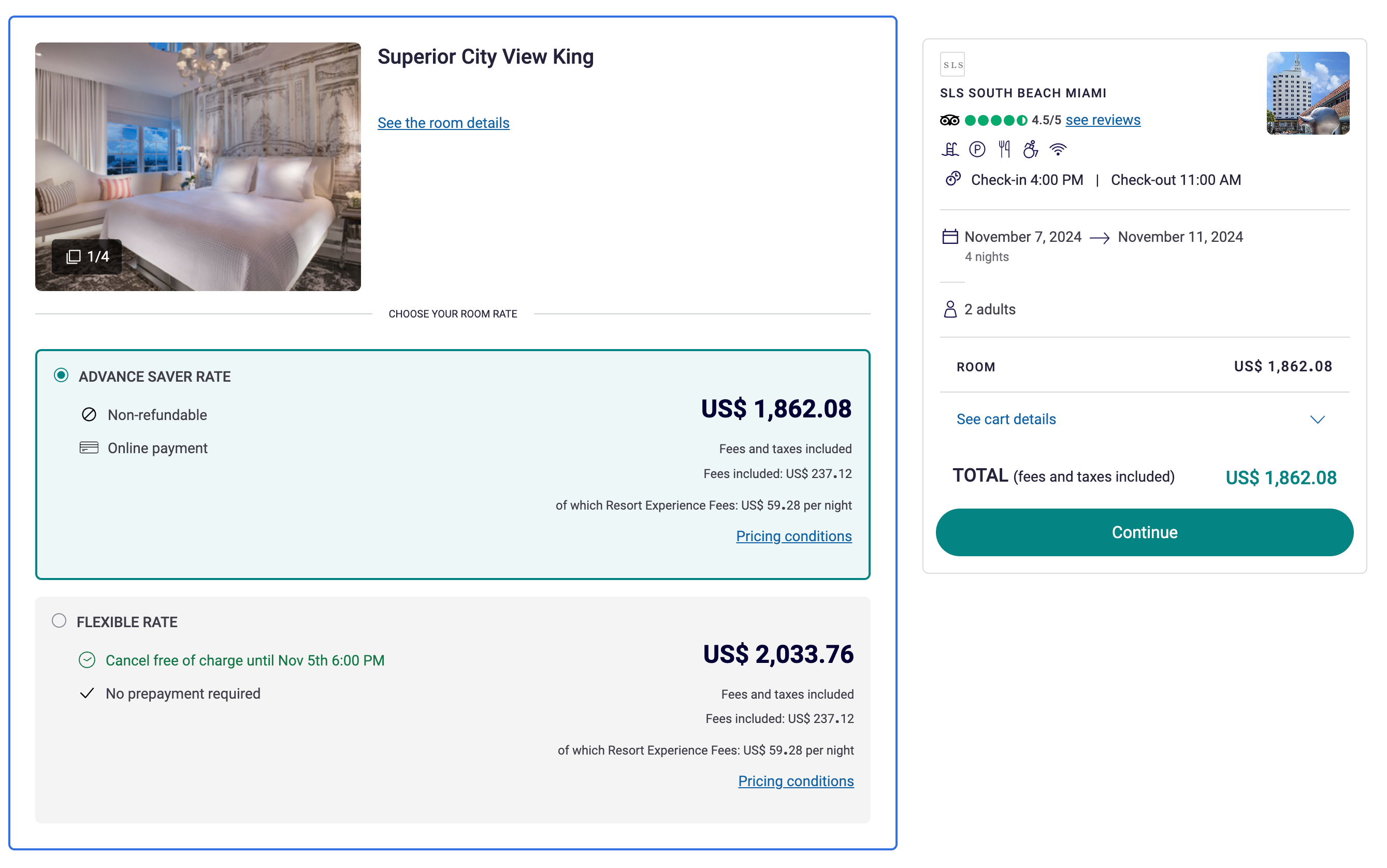 Looking at a two-night stay at SLS South Beach in Miami Beach, Florida, you could redeem 126,700 Aeroplan points for a Superior City View King room. The rate includes taxes and fees but is not refundable.