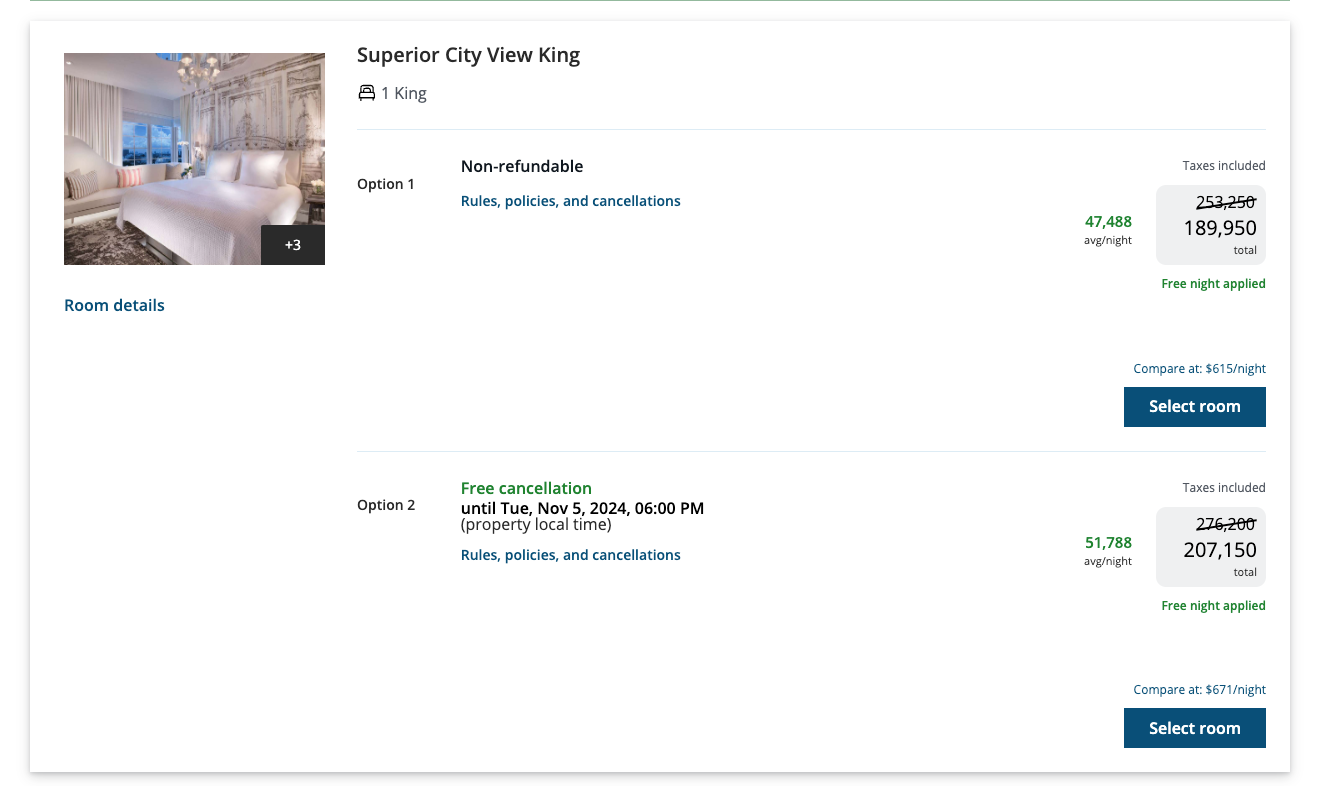 When considering the same hotel, SLS South Beach, for four nights rather than two, you'll find the same Superior City View King room bookable for 189,950 points when the credit card's free night is applied.