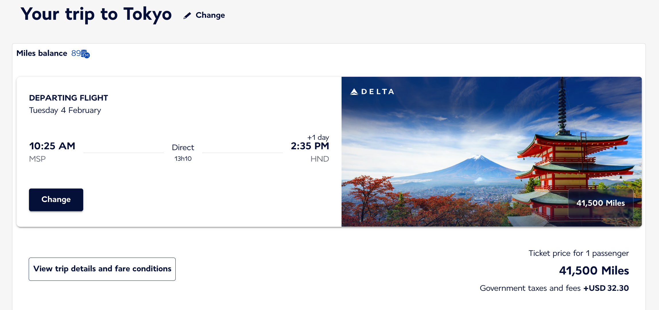 We saw one-way flights from Hartsfield-Jackson Atlanta International Airport (ATL) to Haneda Airport available from 35,000 points and about $33 in fees. As previously mentioned, January is a great time to take advantage of this deal.