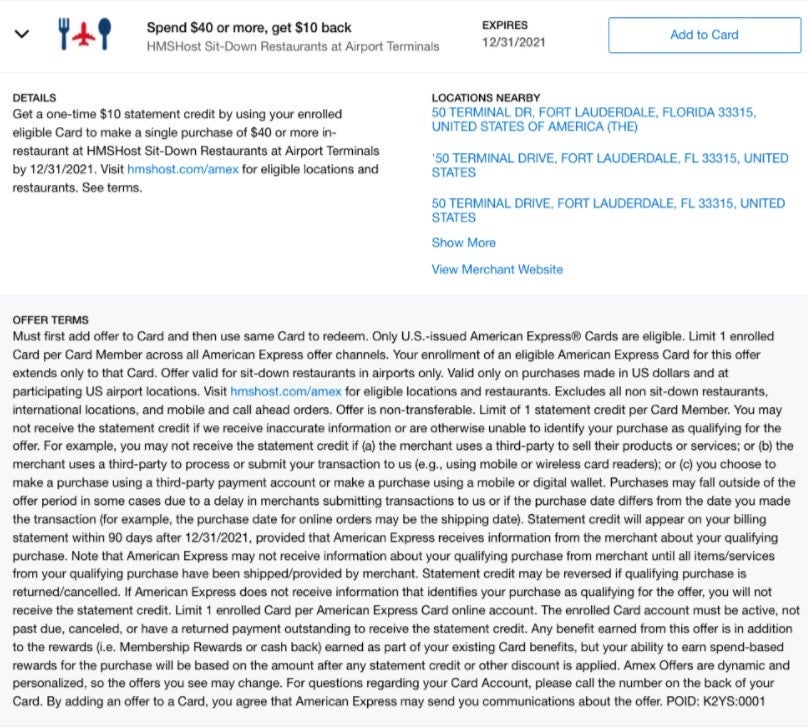 From now until Dec. 31, cardholders can earn a one-time $10 statement credit after spending $40 or more at a sit-down restaurant at airport terminals across the country. It's a good reason to forgo the grab-and-go line and treat yourself to a sit-down meal. In fact, the offer is only good if you sit down to dine. Mobile pickup orders do not qualify for the credit.
