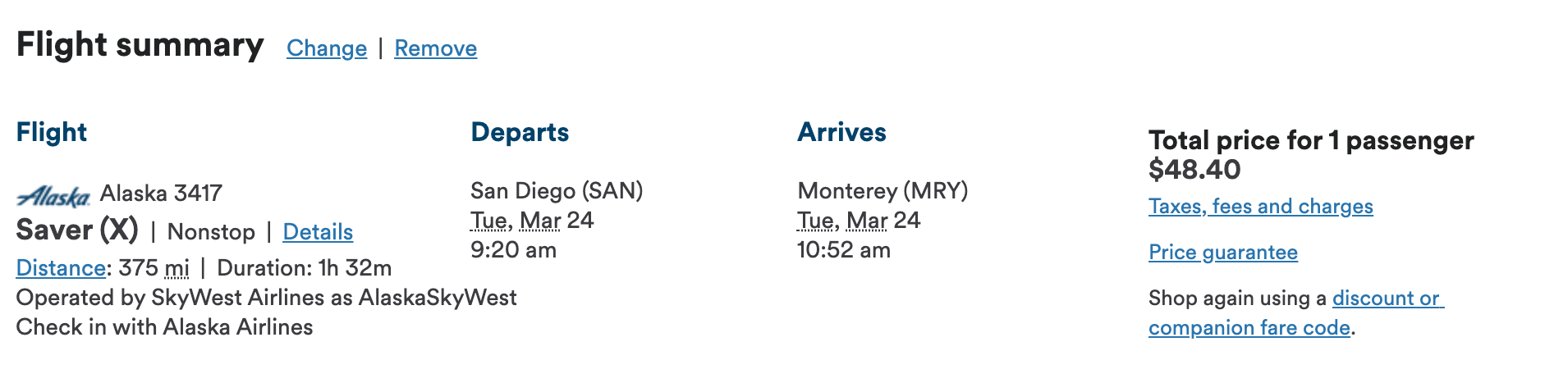 San Diego (SAN) to Monterey (MRY) for $48 one-way in Saver: