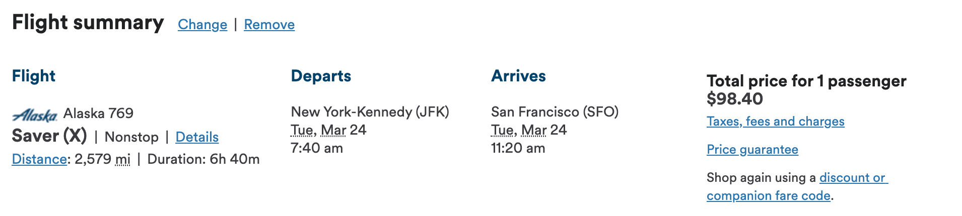 New York (JFK) to San Francisco (SFO) for $98 one-way in Saver:
