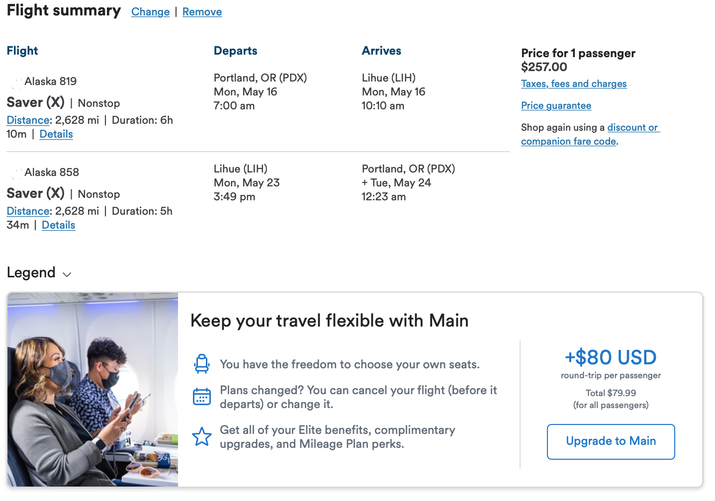 The sale is from key Alaska Air cities such as Seattle, Portland, San Diego, and San Jose. As usual, the best prices apply to Alaska's Saver tier, the airline's most restricted fare. Saver tickets allow one carry-on bag and one personal item, but you don't have an assigned seat. The Main Saver tickets are also discounted. That tier comes with overhead bin space, earlier boarding and allows you to change your ticket without a fee