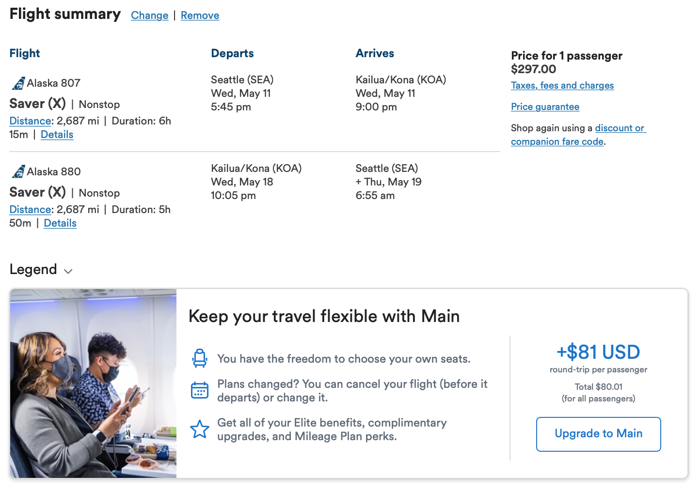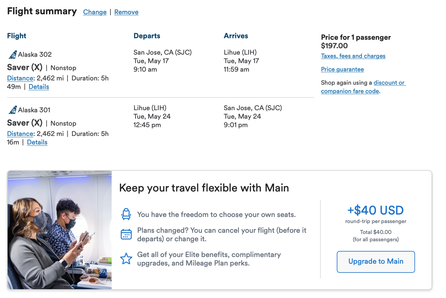 We found nonstop San Diego (SAN) to Maui (OGG) fares for just $197 round-trip. Also, upgrading to Main would cost just $40 with this itinerary.