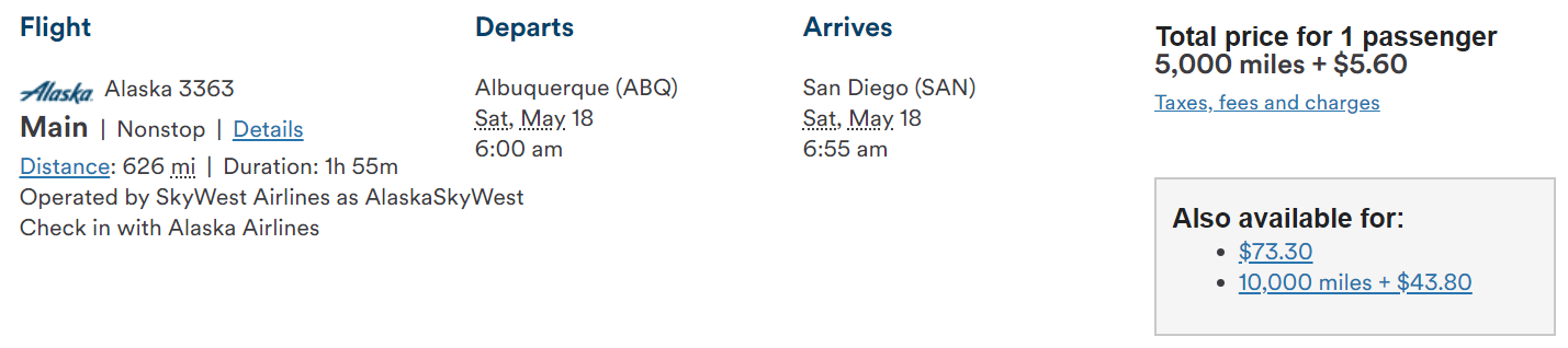Albuquerque (ABQ) to San Diego (SAN) for 5,000 miles + $5.60 in taxes and fees one-way in economy: