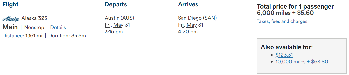 Austin (AUS) to San Diego (SAN) for 6,000 miles + $5.60 in taxes and fees one-way in economy: