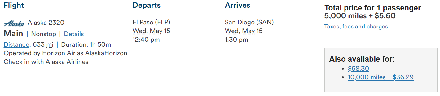 El Paso (ELP) to San Diego (SAN) for 5,000 miles + $5.60 in taxes and fees one-way in economy: