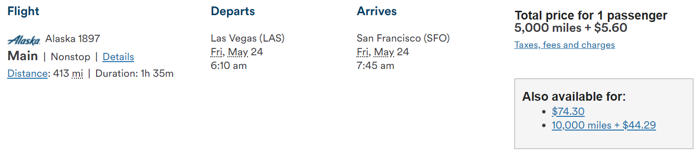 Las Vegas (LAS) to San Francisco (SFO) for 5,000 miles + $5.60 in taxes and fees one-way in economy: