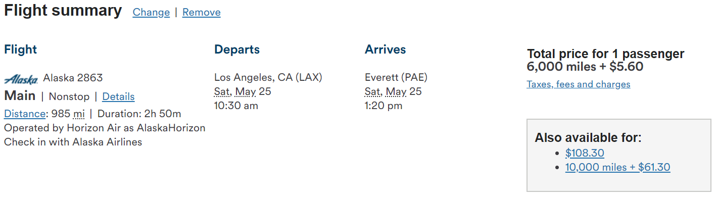 Los Angeles (LAX) to Everett (PAE) for 6,000 miles + $5.60 in taxes and fees one-way in economy: