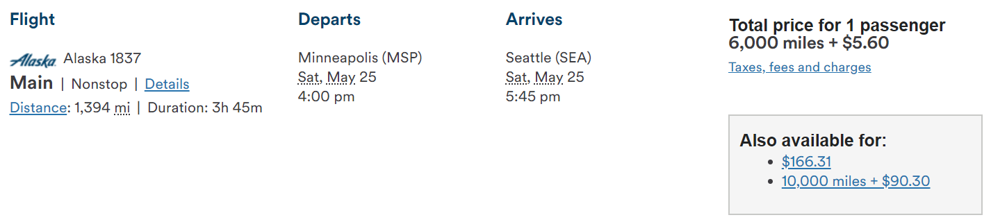 Minneapolis (MSP) to Seattle (SEA) for 6,000 miles + $5.60 in taxes and fees one-way in economy: