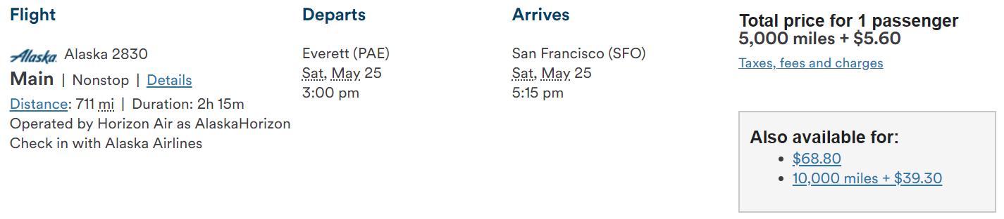 Everett (PAE) to San Francisco (SFO) for 5,000 miles + $5.60 in taxes and fees one-way in economy: