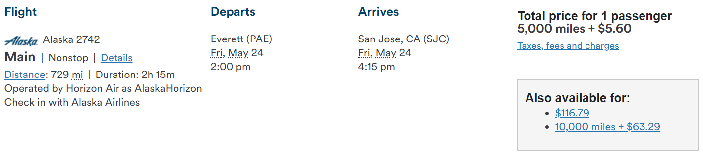 Everett (PAE) to San Jose (SJC) for 5,000 miles + $5.60 in taxes and fees one-way in economy: