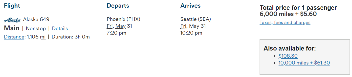 Phoenix (PHX) to Seattle (SEA) for 6,000 miles + $5.60 in taxes and fees one-way in economy: