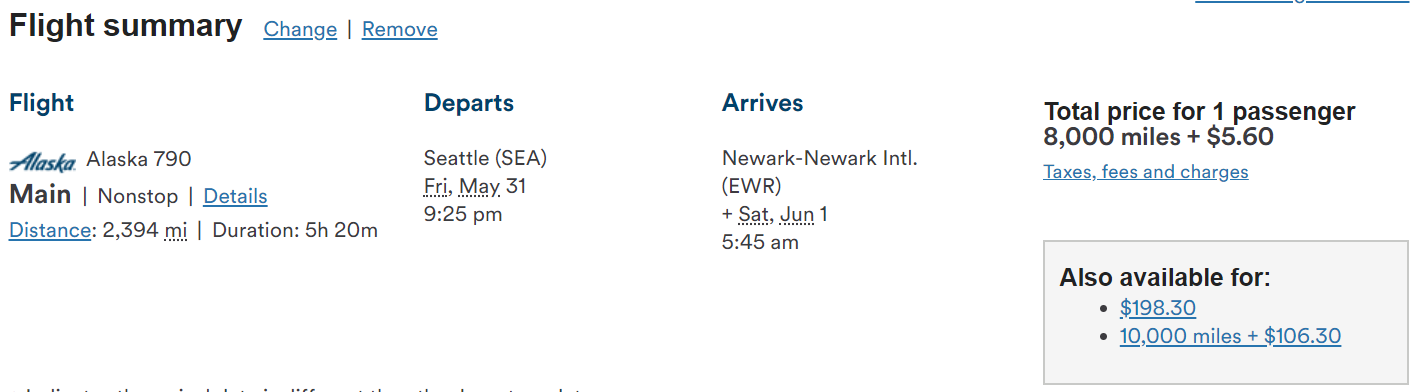 Seattle (SEA) to Newark (EWR) for 8,000 miles + $5.60 in taxes and fees one-way in economy: