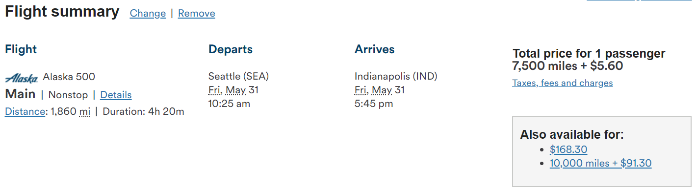 Seattle (SEA) to Indianapolis (IND) for 7,500 miles + $5.60 in taxes and fees one-way in economy: