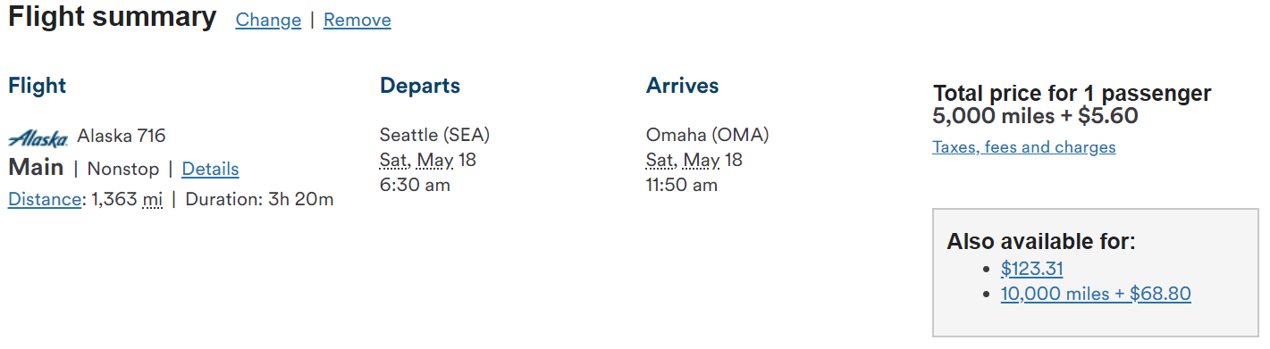 Seattle (SEA) to Omaha (OMA) for 5,000 miles + $5.60 in taxes and fees one-way in economy: