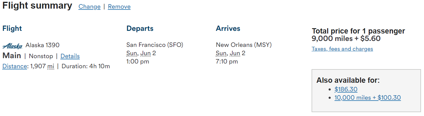 San Francisco (SFO) to New Orleans (MSY) for 9,000 miles + $5.60 in taxes and fees one-way in economy:
