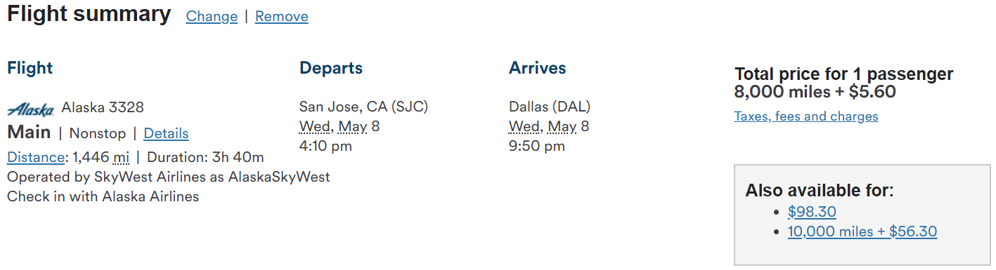 San Jose (SJC) to Dallas Love Field (DAL) for 8,000 miles + $5.60 in taxes and fees one-way in economy: