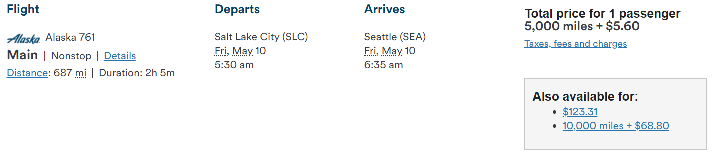 Salt Lake City (SLC) to Seattle (SEA) for 5,000 miles + $5.60 in taxes and fees one-way in economy: