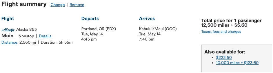 Portland (PDX) to Maui (OGG) for 12,500 miles + $5.60 in taxes and fees one-way in economy: