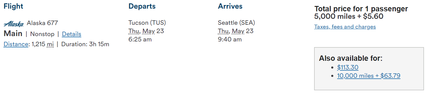 Tucson (TUS) to Seattle (SEA) for 5,000 miles + $5.60 in taxes and fees one-way in economy: