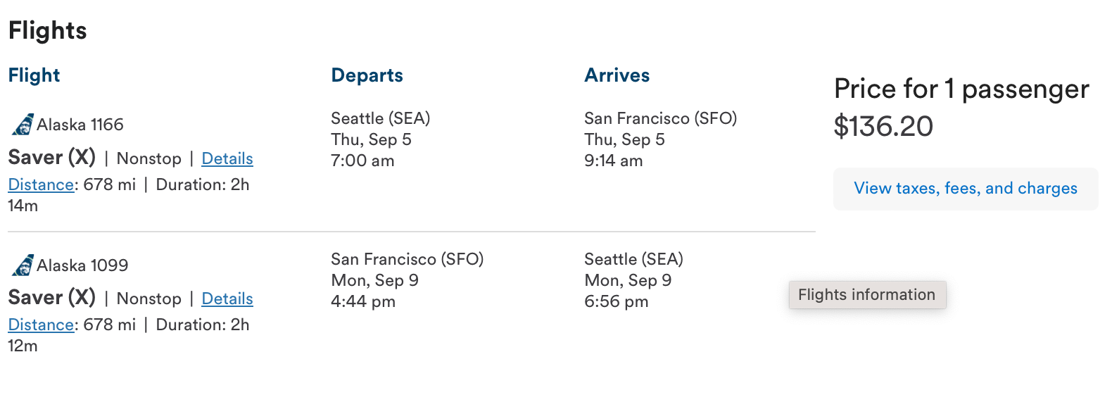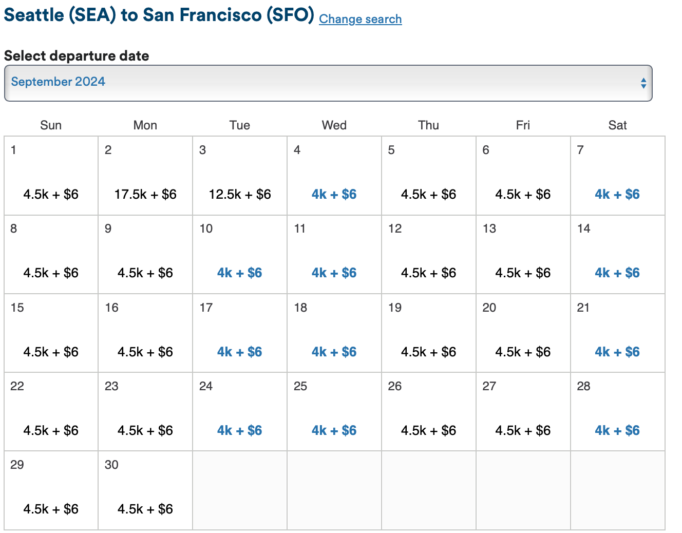 We always recommend using the calendar tool on Alaska Airlines' website to search for flights — it will show you the lowest fares available for a specific month. Using the calendar view, we found one-way flights from Seattle to San Francisco in September for as low as 4,000 miles, plus $6 in taxes and fees.