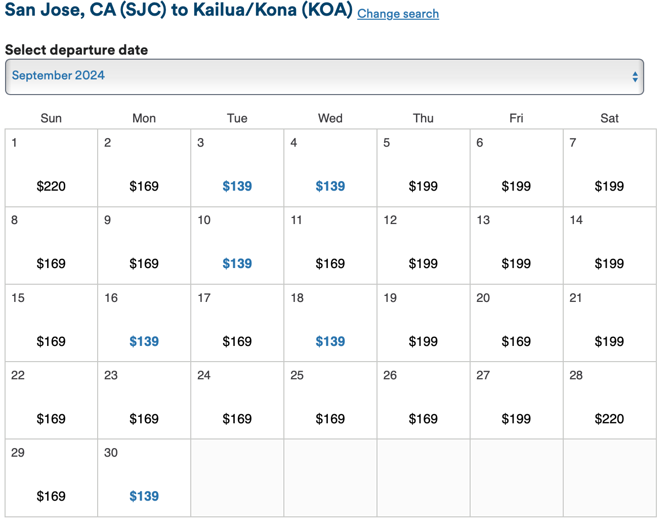 Additionally, in September, there is good availability from San Jose, California, to the Big Island starting at $139 each way.