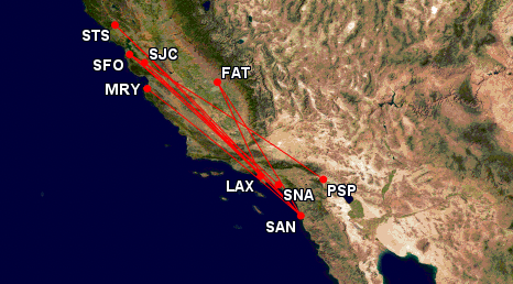 - Los Angeles (LAX): Fresno (FAT), San Francisco, San Jose (SJC), Santa Rosa (STS)
