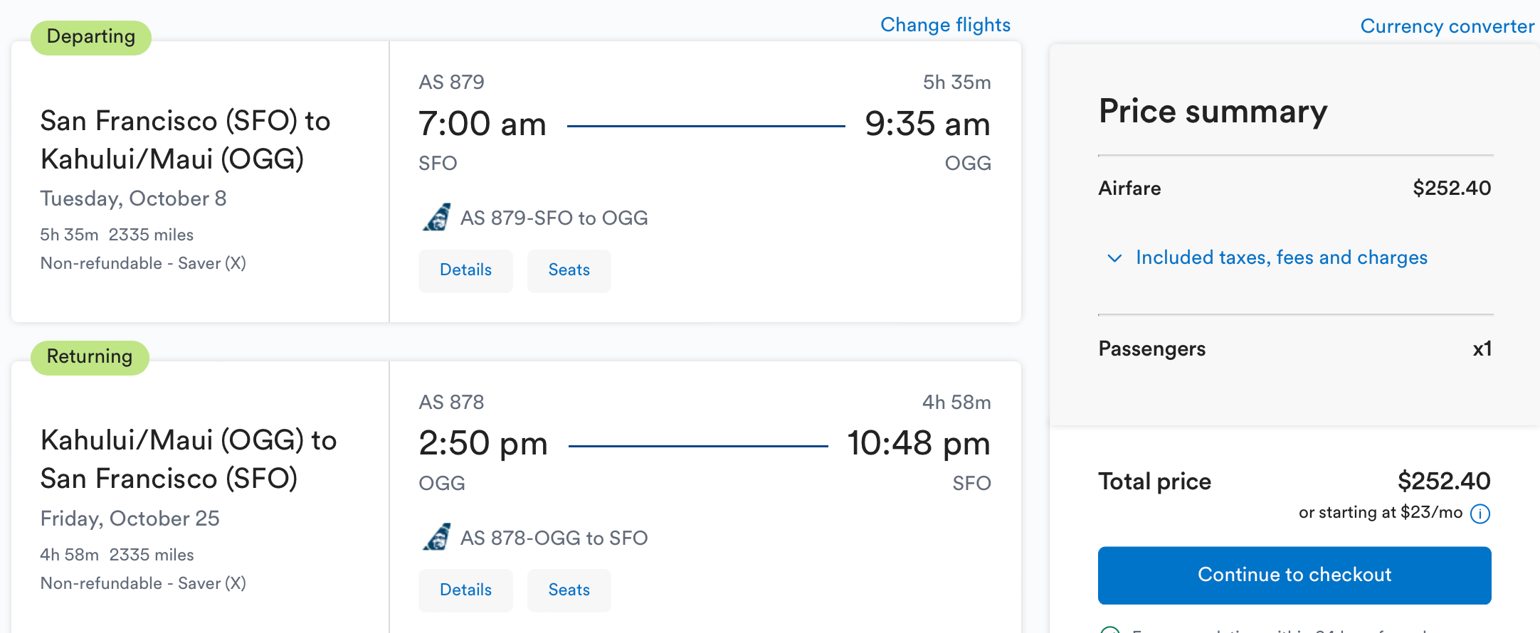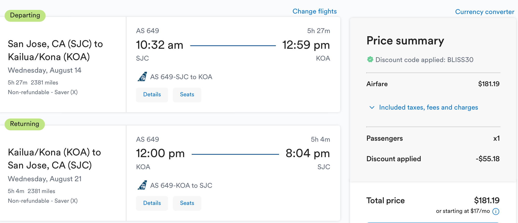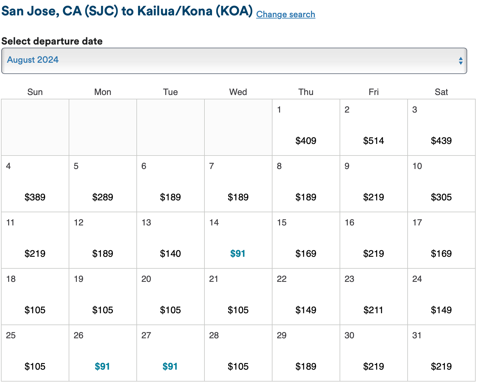 We like Alaska's website more than most airlines' because it's very user-friendly. Pro tip: After you decide on the itinerary you want, choose to view prices using their calendar tool. That will show you the lowest fares available for a specific month. By doing this, we found one-way nonstop flights from San Jose to Hawaii's Big Island — that one-way is available in August for as low as $91 in this sale.