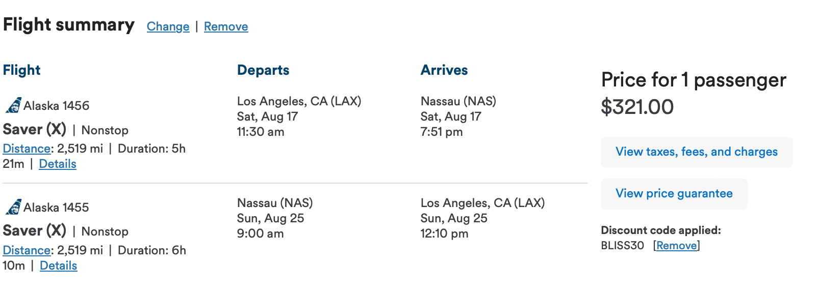 This sale offers good availability for discounted travel from Los Angeles to the Bahamas in August as well. You can fly nonstop from Los Angeles to Nassau for $321 round-trip.