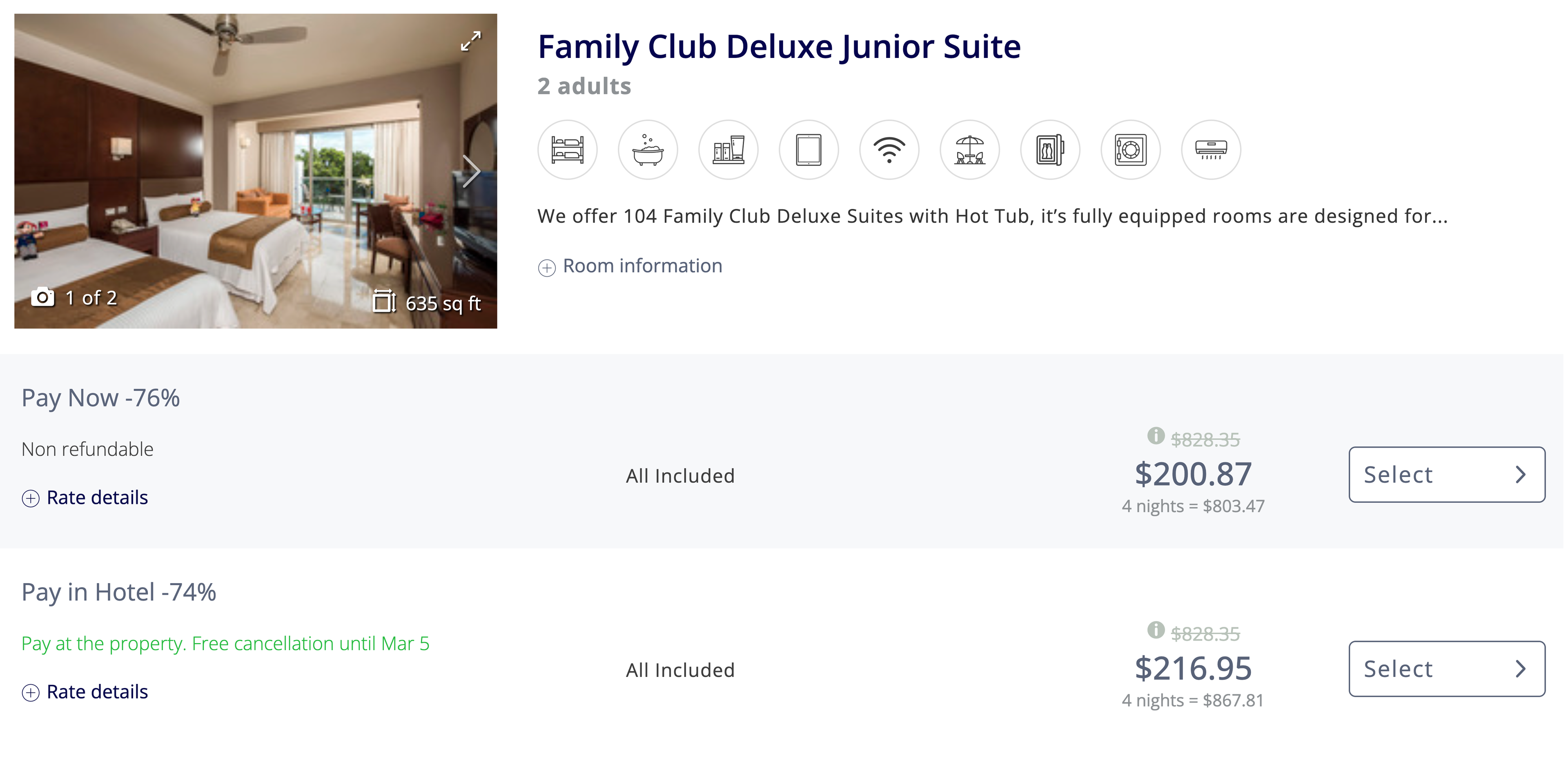 Searching the Princess Hotels & Resorts website, I found a 4-night stay in a Family Club Deluxe Junior Suite during those dates for a total of $867.81 when paid at the property. This option includes free cancellation until the day before arrival.