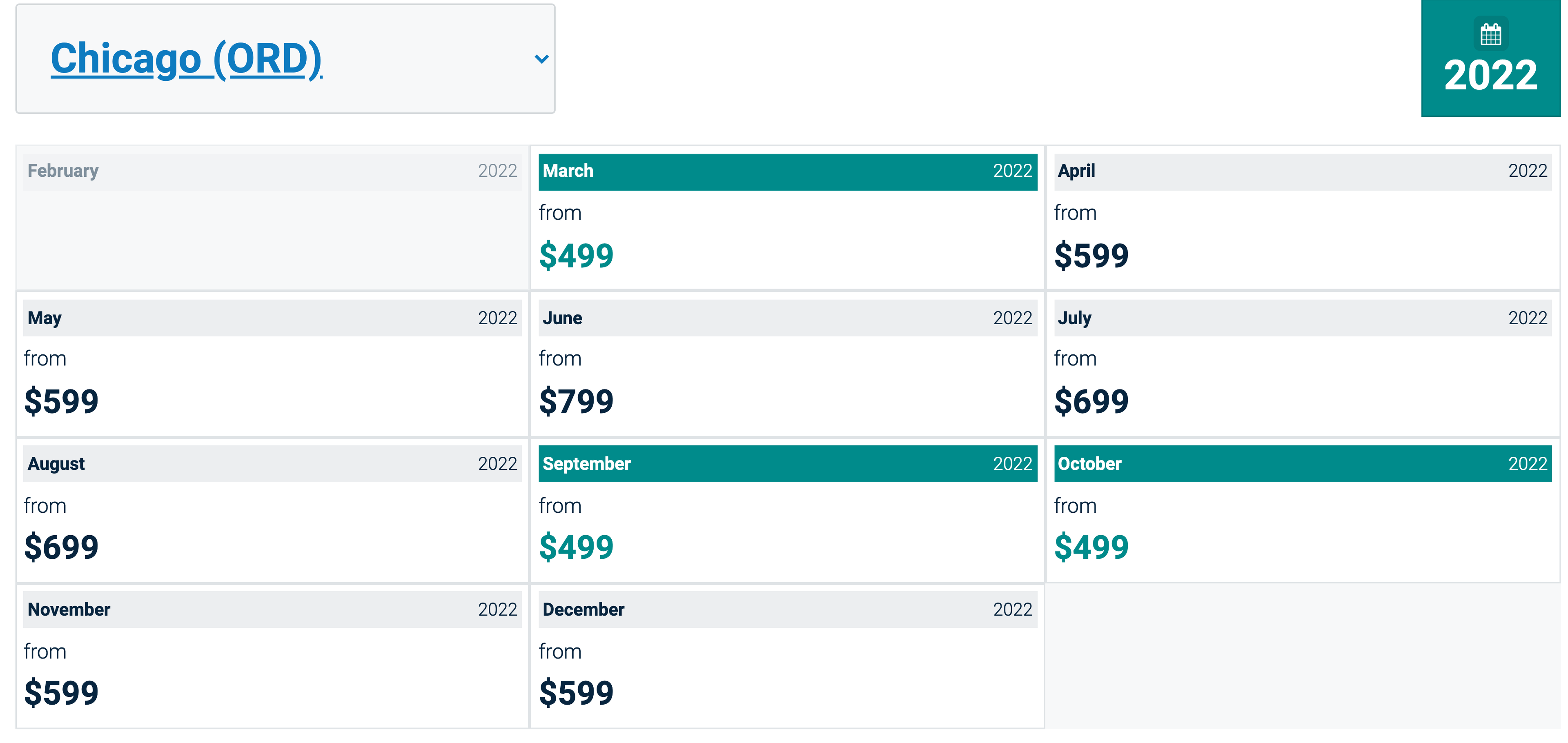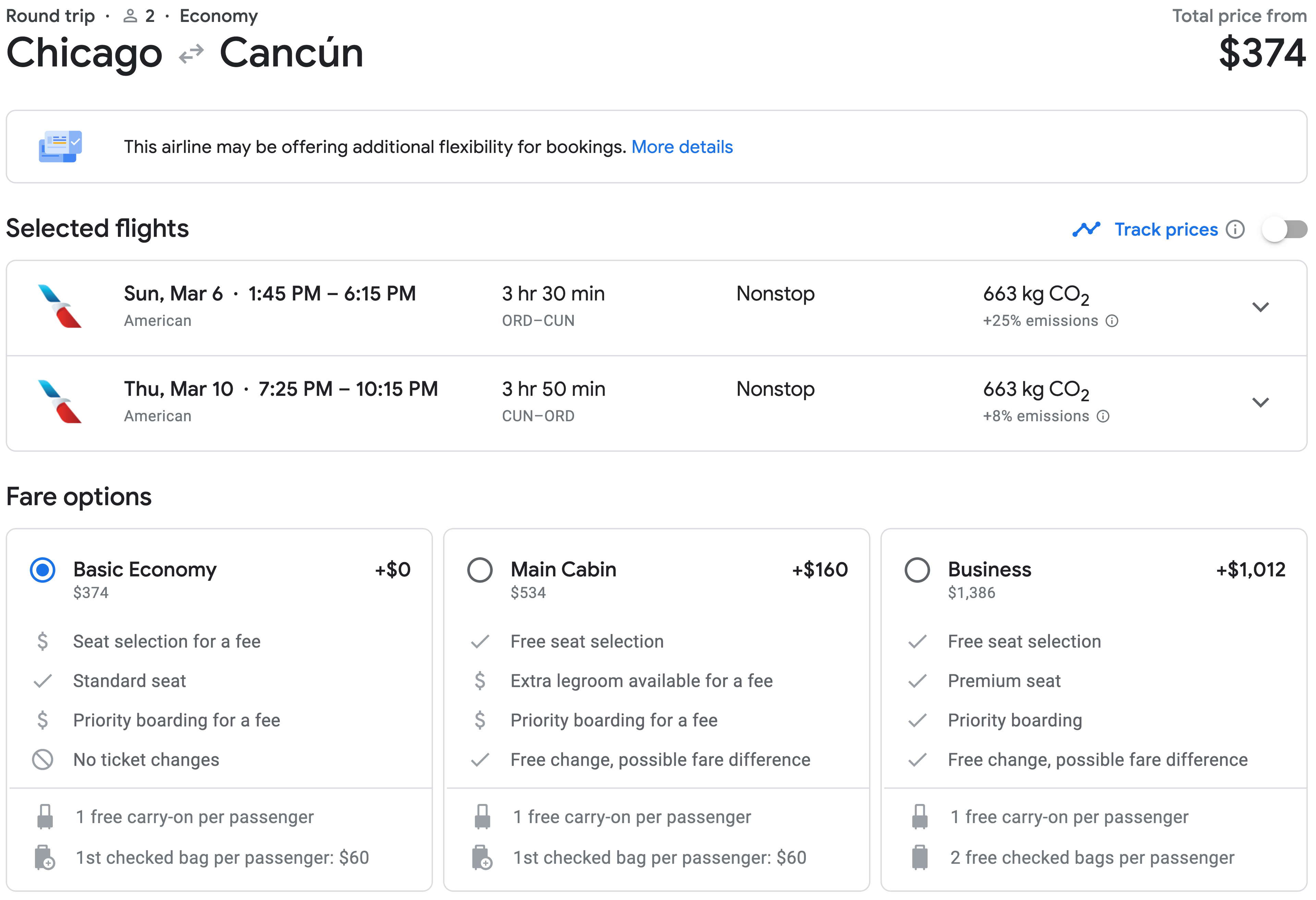Looking at nonstop flights from Chicago (ORD) to Cancun (CUN), departing on March 6, and returning on March 10, I found basic economy tickets on American Airlines for $187 round-trip per person ($374 for two).
