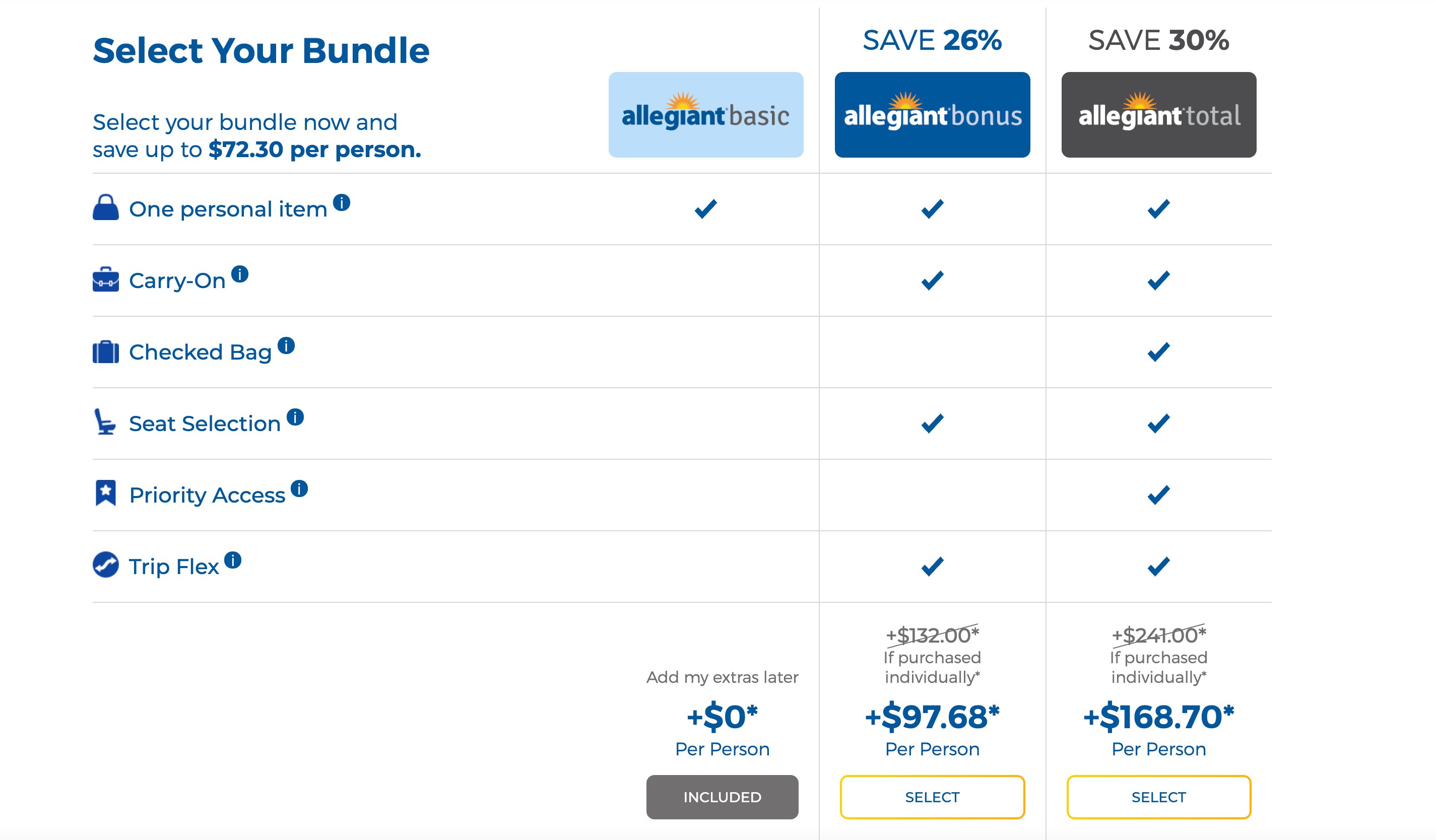 Allegiant also offers bundles that include a carry-on, checked baggage, seat selection and priority check-in at an additional fee. You also have the option to pay for these perks individually.