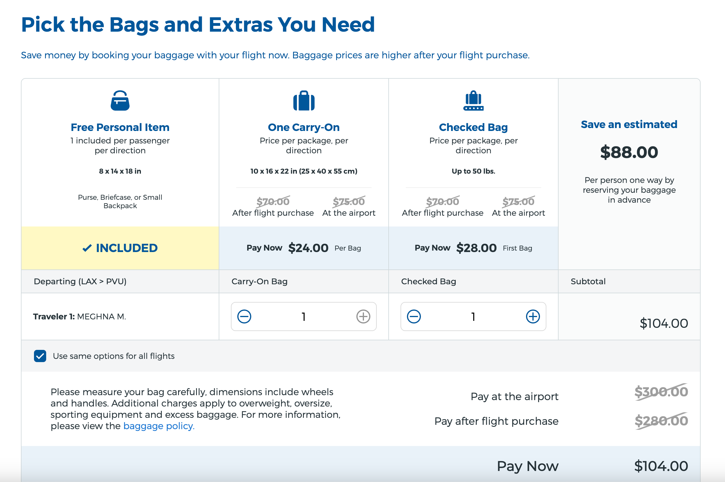 A carry-on bag costs $24 one-way, and a checked bag is $28 one-way. So, if you ended up needing both for your trip, you'd spend an additional $104.
