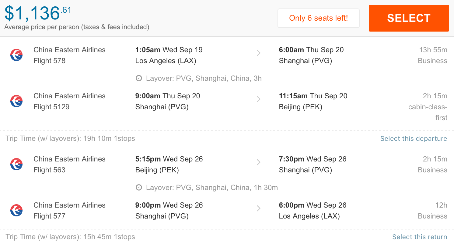 China Eastern is currently offering amazing business class fares from Los Angeles (LAX) to Beijing (PEK) from $1,137 round-trip for travel from late August through the beginning of October. The catch to this deal is that it's only available through online travel agencies (OTAs) — not with the airline directly. It's unclear whether this is a mistake fare, and if the airline will actually honor the tickets, so keep that in mind when making additional plans. By DOT law, airlines are allowed to cancel mistake fare tickets. But based on a FlyerTalk thread, this deal has been around for over a week, and China Eastern hasn't cancelled anyone's discounted tickets yet.