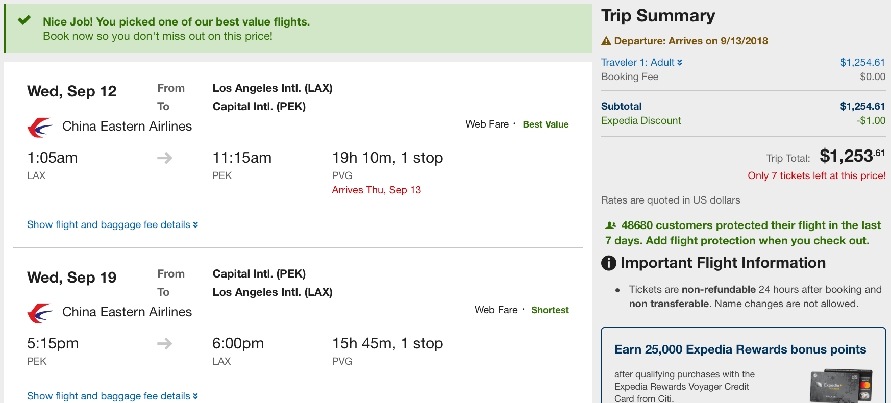 Los Angeles (LAX) to Beijing (PEK) for $1,254 round-trip via Expedia: