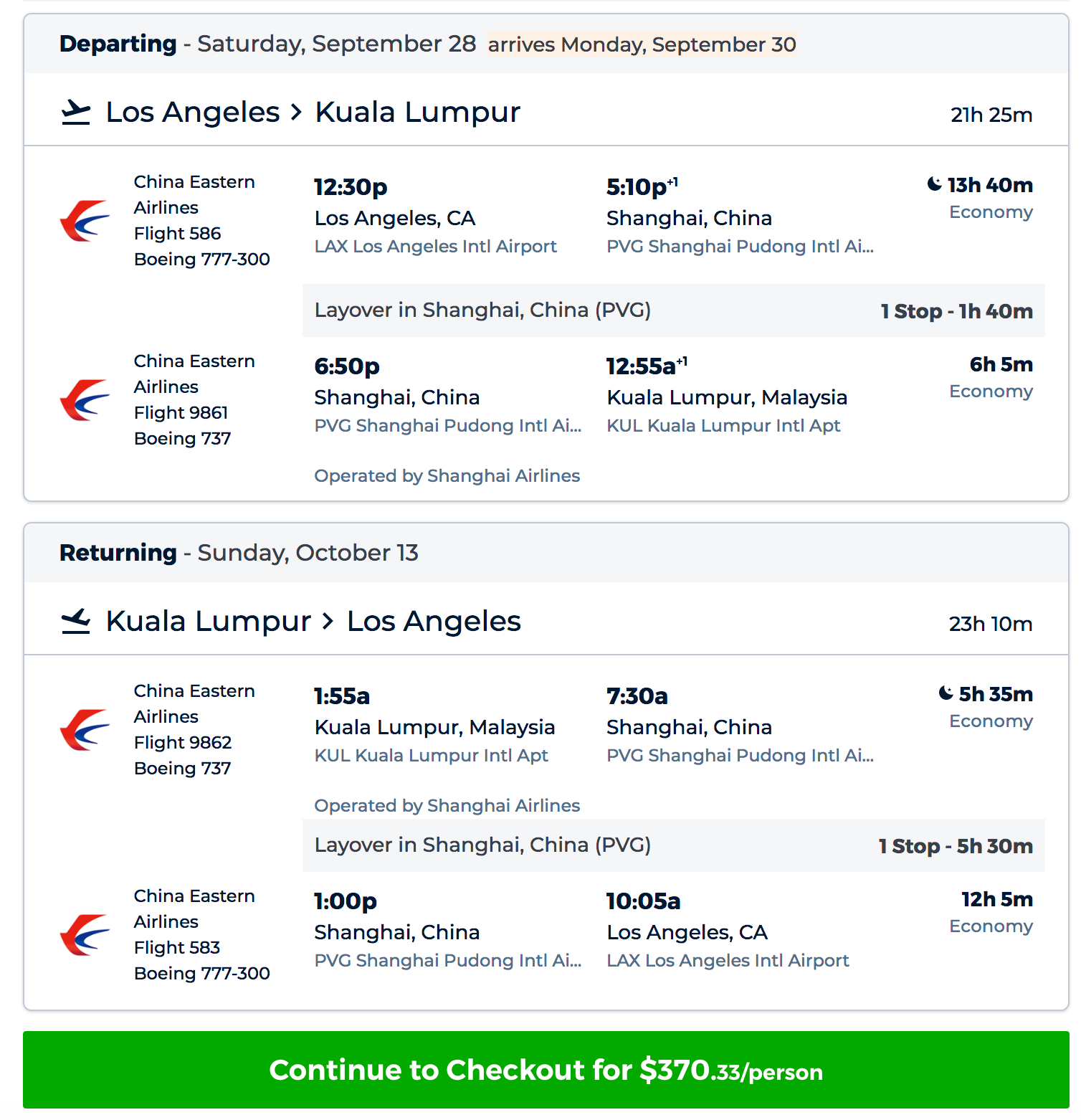 Los Angeles (LAX) to Kuala Lumpur (KUL) for $370 round-trip on China Eastern: