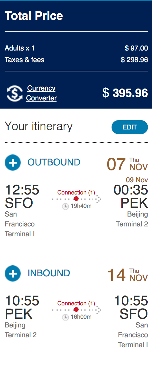 San Francisco (SFO) to Beijing (PEK) for $396 round-trip on China Southern: