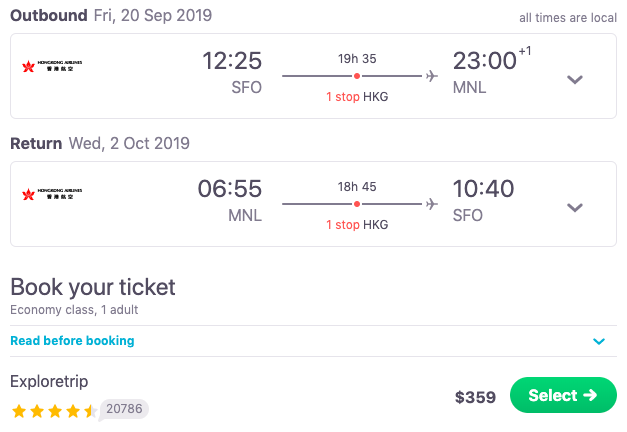 San Francisco (SFO) to Manila (MNNL) for $359 round-trip on Hong Kong Airlines via Exploretrip: